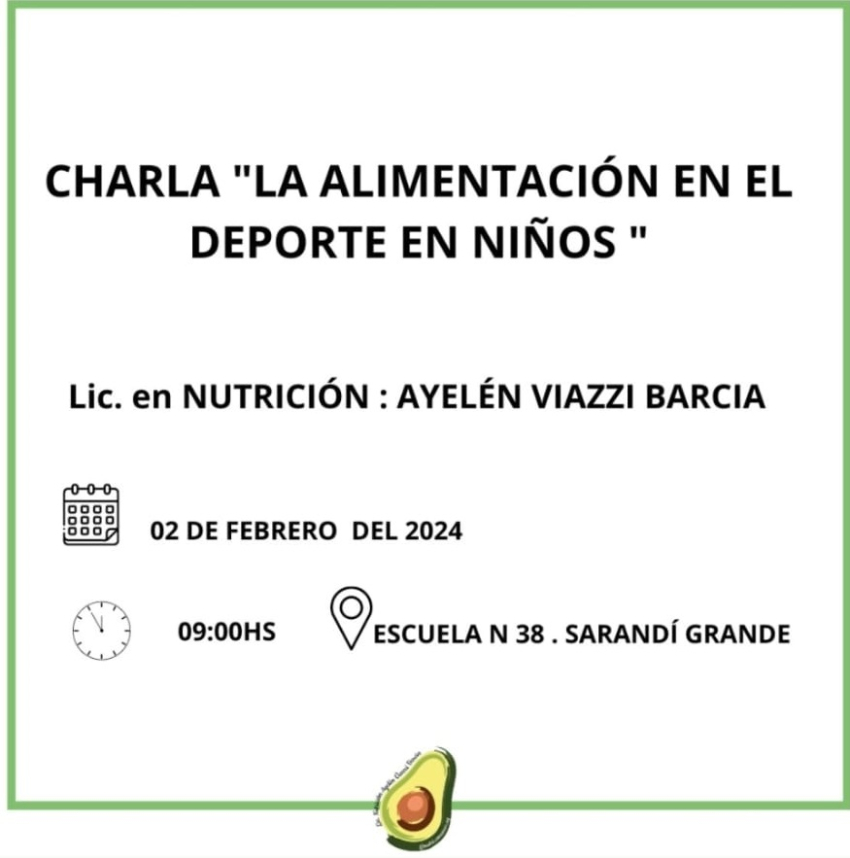 Mañana viernes 2 de febrero, a la hora 9, los niños que forman parte del Programa "Escuelas de Verano" en la Escuela 38 de Sarandí Grande tendrán la oportunidad de asistir a una charla especial sobre "La Alimentación en el Deporte", a cargo de la Licenciada en Nutrición Ayelén Viazzi.