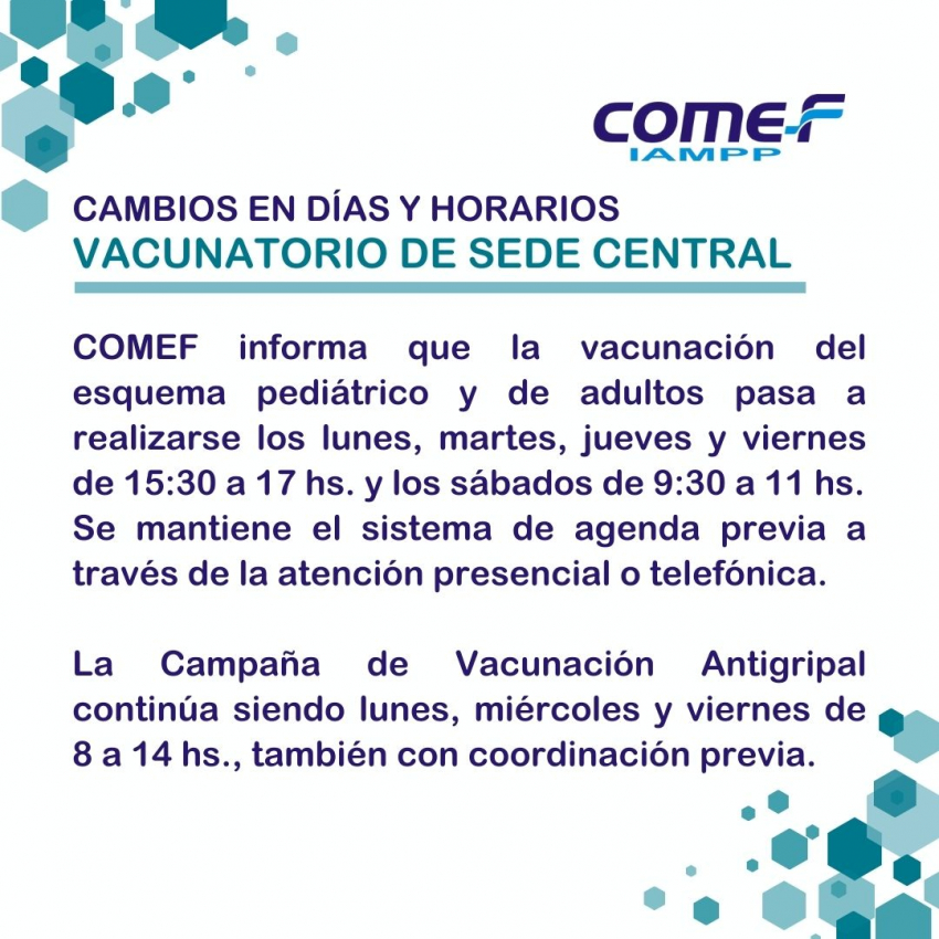 COMEF informa que la vacunación del esquema pediátrico y de adultos en su sede central en Florida pasa a realizarse los lunes, martes, jueves y viernes de 15:30 a 17 hs. y los sábados de 9:30 a 11 hs. Se mantiene el sistema de agenda previa a través de la atención presencial o telefónica. La Campaña de Vacunación Antigripal continúa siendo lunes, miércoles y viernes de 8 a 14 hs., también con coordinación previa.