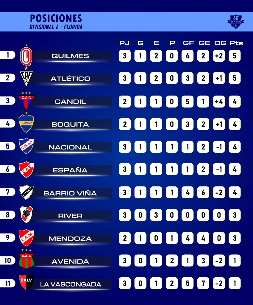 Tras diputarse la 3era fecha de la Divisional A de Florida, así quedó la tabla de posiciones: en primer lugar se encuentra Quilmes con 5 puntos, seguido por Atlético con 5 puntos y C.A.C. con 4 puntos. Candil e I.D. Boquita de Sarandí Grande empatan en el cuarto lugar con 4 puntos cada uno, mientras que Nacional se ubica en el sexto lugar con 4 puntos. España, Barrio Viña y River ocupan los siguientes lugares con 4, 4 y 3 puntos respectivamente. Mendoza y Avenida empatan en el noveno lugar con 3 puntos cada uno, mientras que La Vascongada cierra la tabla con 1 punto.
