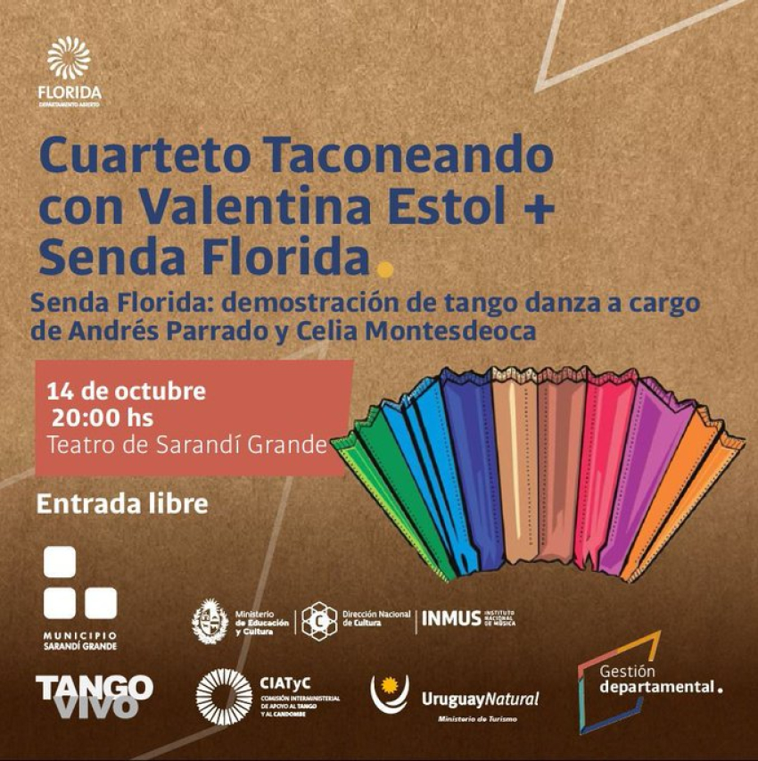 El 14 de octubre a las 20:00 hs, el Teatro de Sarandí Grande será el escenario de una noche dedicada al tango. El evento contará con la actuación del Cuarteto Taconeando, con la participación especial de Valentina Estol.