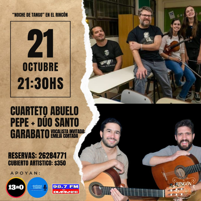 El Dúo de Sarandí Grande Santo Garabato, integrado por Gustavo Santos y Federico Garabagno, se presentará el 21 de octubre a las 21.30 hs en El Rincón de Silverio en Alejo Rossell y Rius 1655, Villa Dolores, Montevideo.