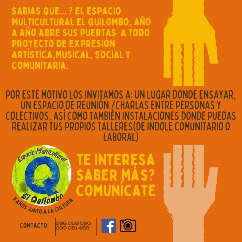 Para más información o para coordinar el uso del espacio, Espacio Multicultural El Quilombo puede ser contactado a través de sus números de teléfono disponibles en redes sociales como Facebook e Instagram: 098 069 590 / 099 081 458.