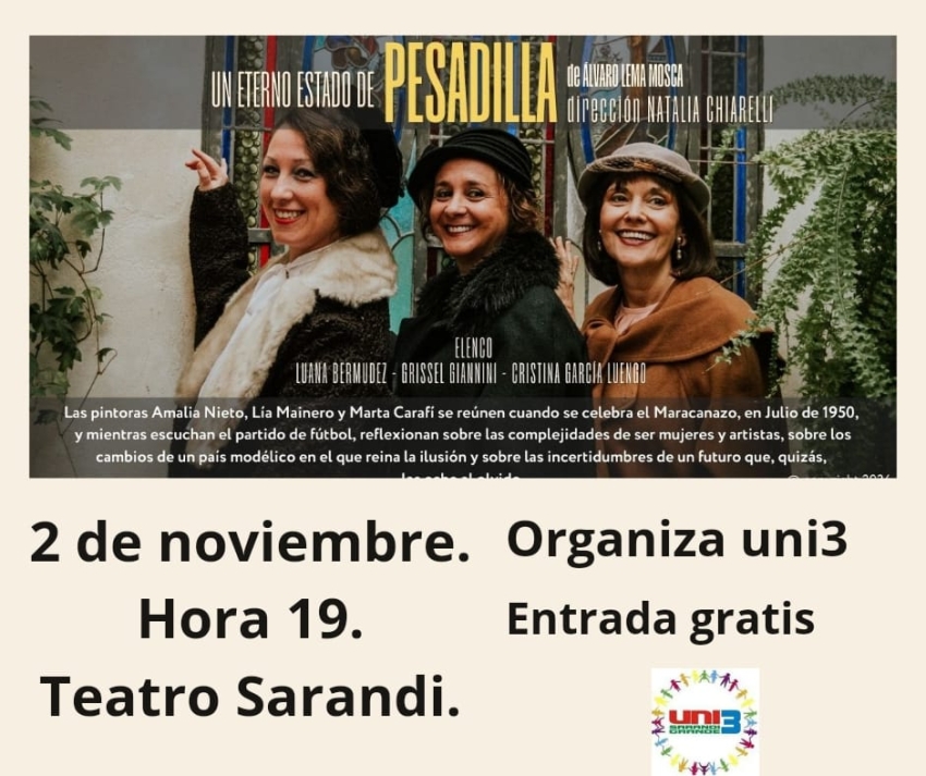 El próximo sábado a las 19:00 horas, se presentará en el Teatro de Sarandí Grande la obra "Un Eterno Estado de Pesadilla", dirigida por Natalia Chiarelli y escrita por Álvaro Lema Mosca.
