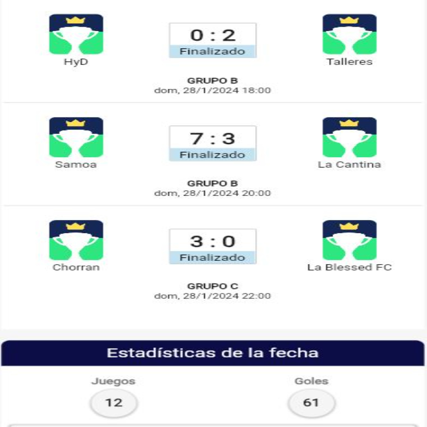 Talleres ganó 2 a 0 a HyD, Samoa 7 a 3 a La Cantina, y Chorran 3 a 0 a La Blessed FC anoche por el Campeonato Barrial de Sarandí Grande, organizado por el Club Deportivo y Social Sarandí.