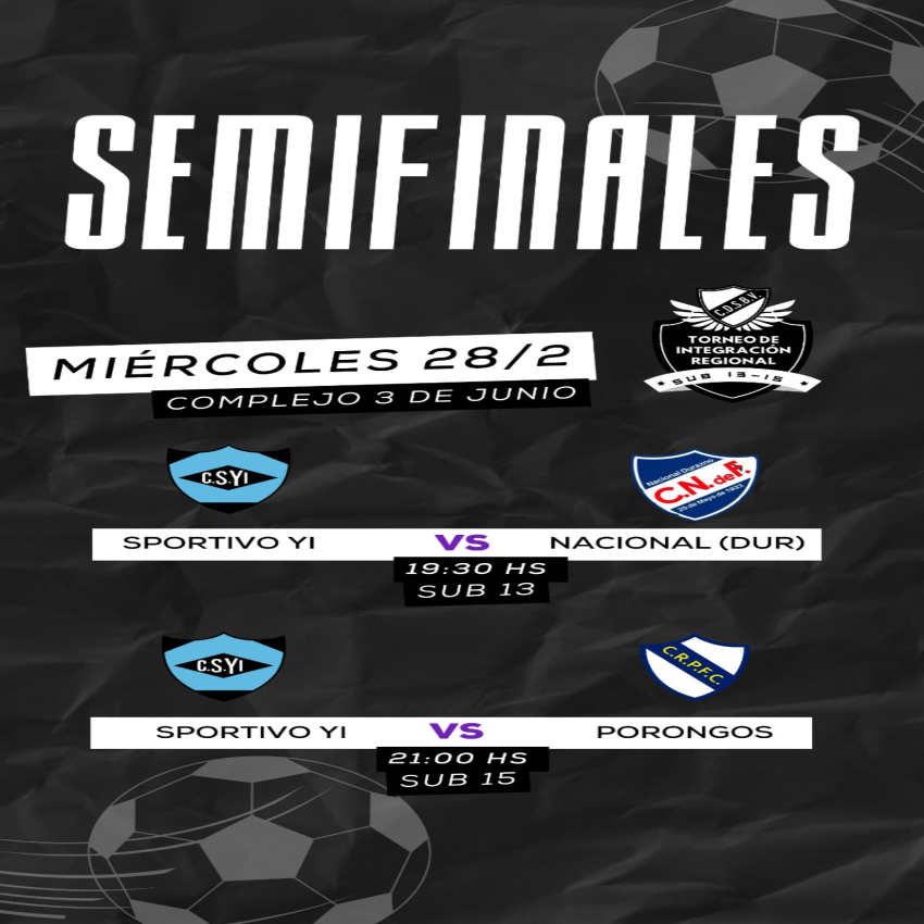 Hoy se disputarán las semifinales de Categoría Sub 13 entre Nacional de Durazno y Sportivo Yí, y Sportivo Yí y Porongos, por el Torneo Juvenil "Maestro Cono Fleitas" en Complejo 3 de Junio de Barrio Viña en Sarandí Grande. Mañana Central y Barrio Viña jugarán en Sub 13 y Sub 15.