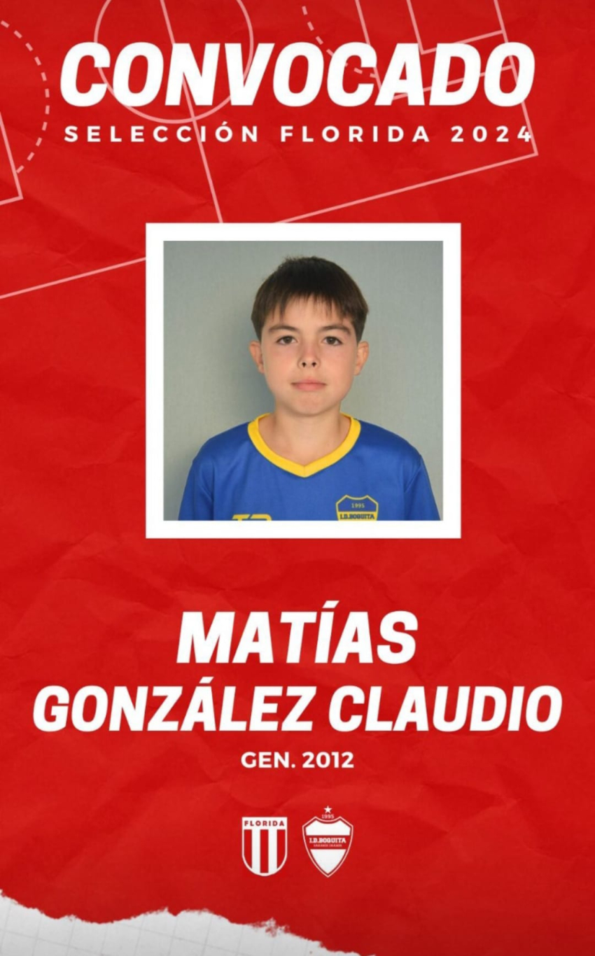 El niño Matías González Claudio, jugador de la generación 2012 perteneciente a Institución Deportiva Boquita de Sarandí Grande, fue convocado para participar en la selección de Florida con miras a sus próximos compromisos.