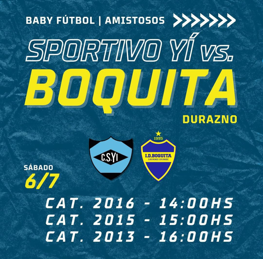 Equipos de baby fútbol de la Institución Deportiva Boquita disputarán tres partidos amistosos el próximo sábado frente a Sportivo Yí en Durazno. A las 14 hs se enfrentarán las categorías 2016, a las 15 hs la 2015 y a las 16 hs la 2013.