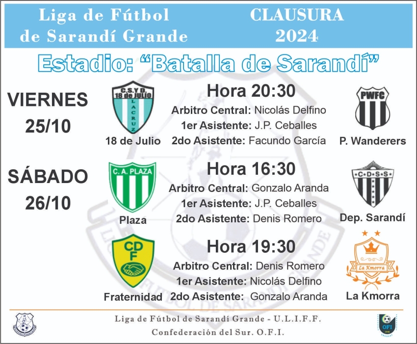Mañana dará comienzo el Torneo Clausura 2024 de la Liga de Fútbol de Sarandí Grande, en el Estadio "Batalla de Sarandí". El primer encuentro está programado para mañana a las 20:30 hs, donde se enfrentarán Pintado Wanderers y Club 18 de Julio de La Cruz.