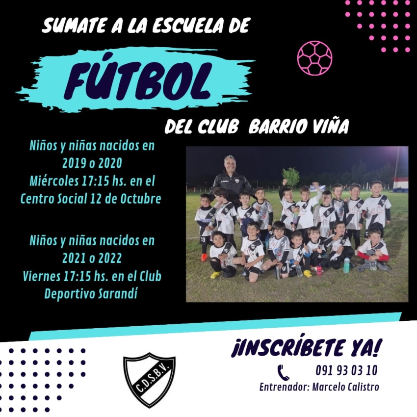 El Club Deportivo y Social Barrio Viña de Sarandí Grande lanzó una convocatoria para la Escuela de Fútbol, dirigida a niños y niñas nacidos en 2019, 2020, 2021 y 2022, en Sarandí Grande. Las clases se desarrollan en dos grupos según el año de nacimiento: los nacidos en 2019 o 2020 entrenan los miércoles a las 17:15 horas en el Centro Social 12 de Octubre, mientras que los nacidos en 2021 o 2022 lo hacen los viernes a las 17:15 horas en el Club Deportivo Sarandí.