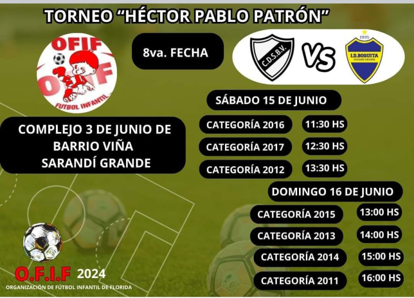 El Club Deportivo y Social Barrio Viña recibirá éste fin de semana en el Complejo 3 de Junio a Institución Deportiva Boquita por la 8va. fecha del Torneo de Futbol Infantil Héctor Pablo Patrón, en jornada que comenzará el sábado a las 11.30 hs con categoría 2016, y continuará con categoría 12.30 hs con categoría 2017, 13.30 hs con categoría 2012, 13.00 hs con categoría 2012. El domingo se enfrentarán las categoría 2015 a las 13.00 hs, 2013 a las 14.00 hs y 2014 a las 15.00 hs.